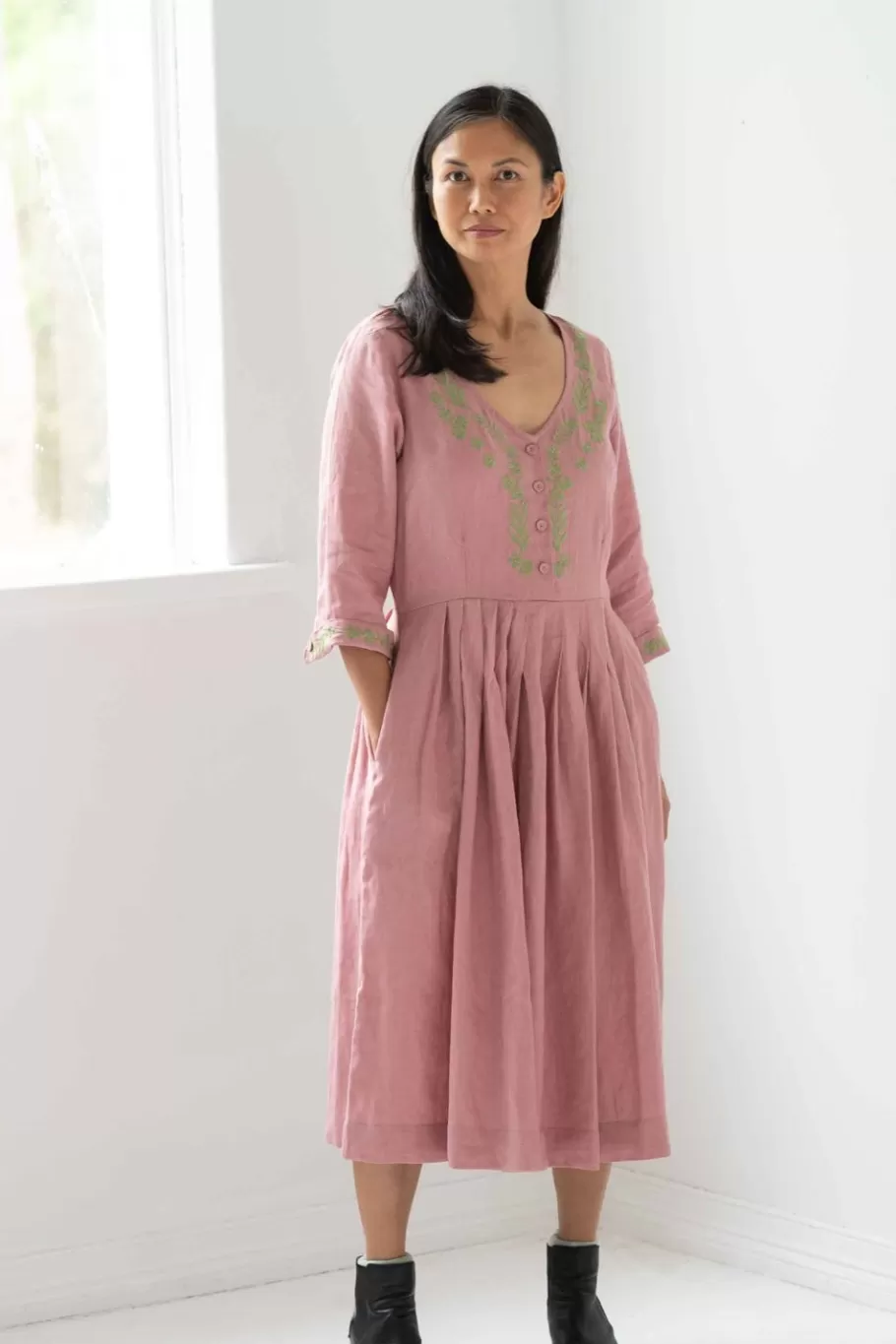 It Is Rose Pink And Has Beautiful Matte Embroidery In A Contrast Green On The Bodice And Sleeve Cuffs.