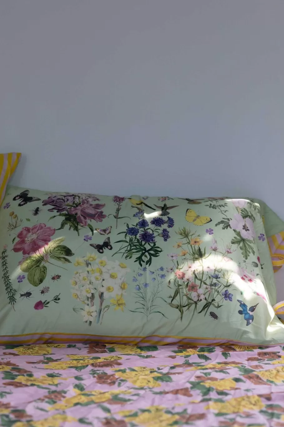 This Reversible Pillowcase Set Features Vintage Illustrations Of Flowers, Birds, Bees And Insects On The Front On A Mid Minty Green Background.