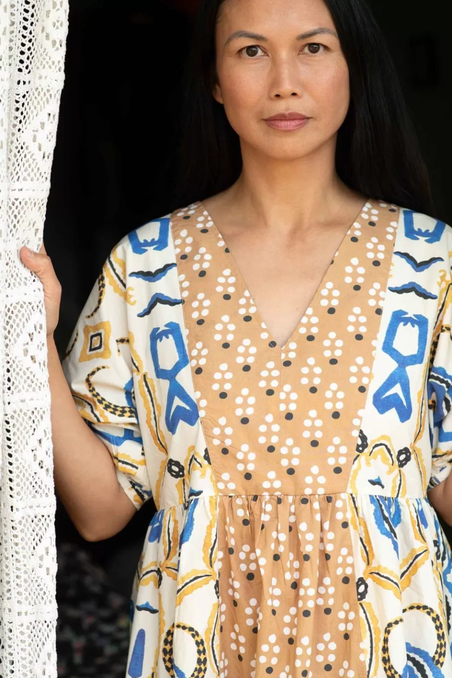 Loose Fitting ‘V’ Neck Smock Dress, Now With A Contrast Print Panels At Centre Front And Back On Bodice And Skirt.