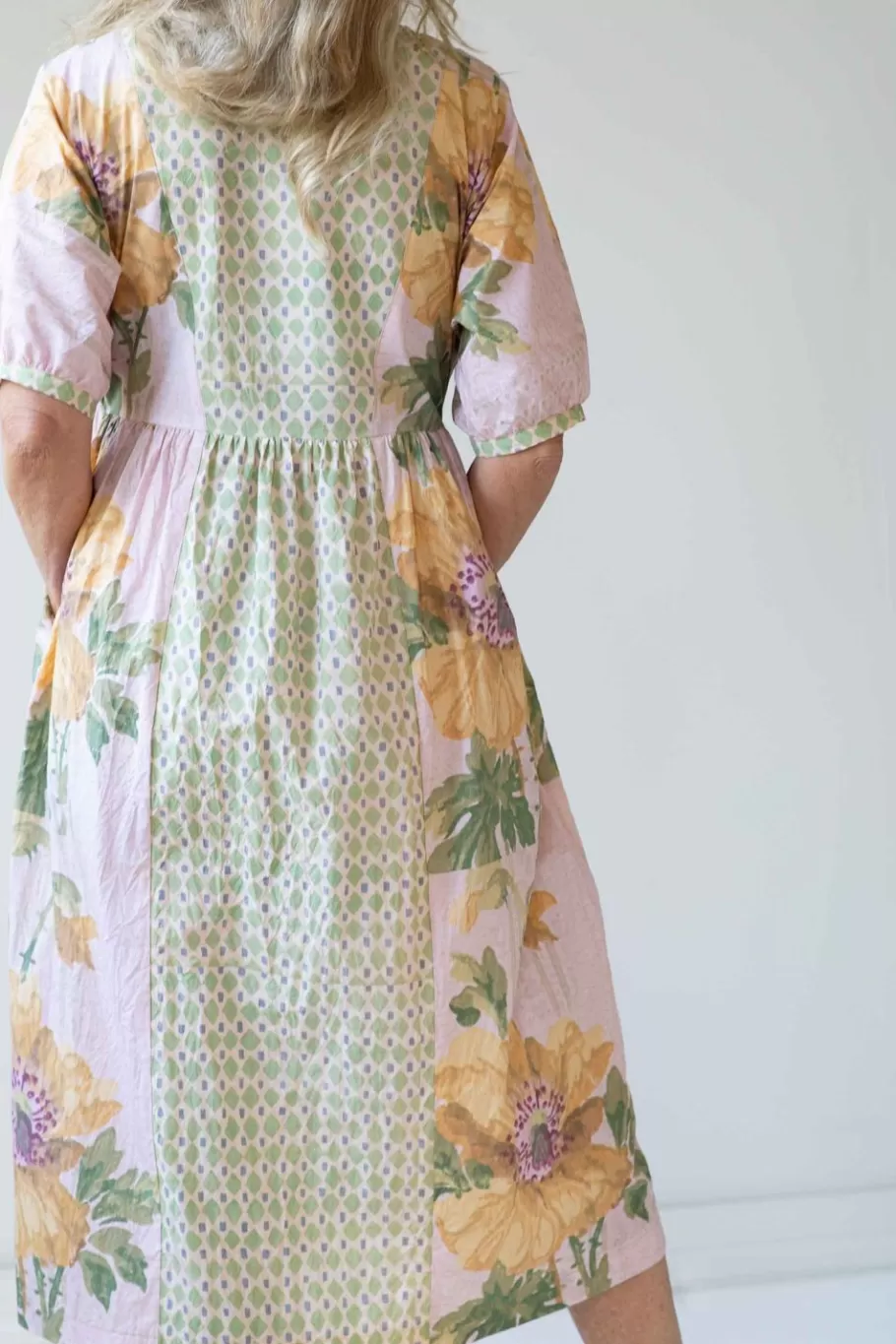 Loose Fitting ‘V’ Neck Smock Dress, Now With A Contrast Print Panels At Centre Front And Back On Bodice And Skirt.