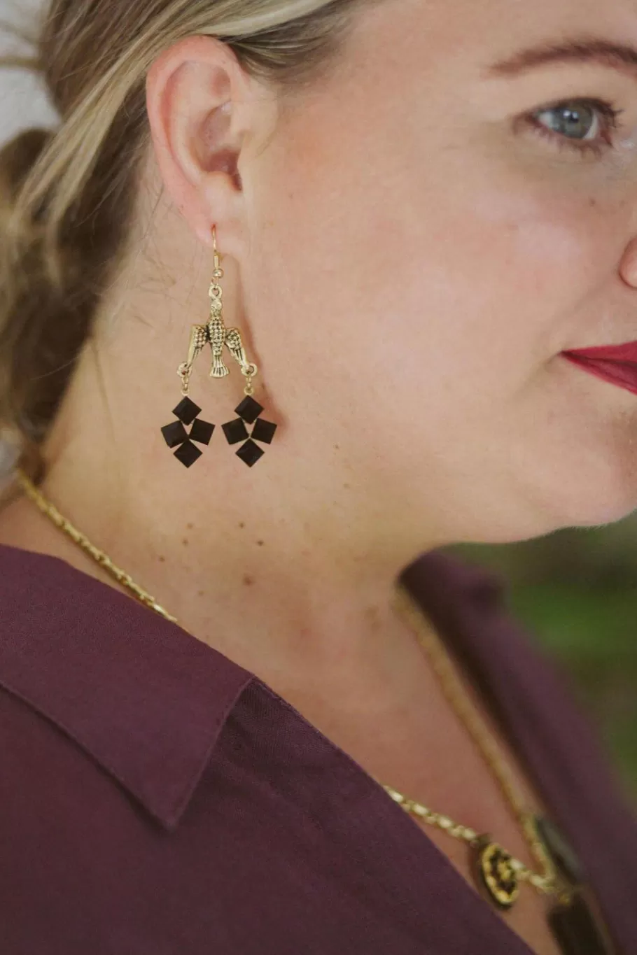 An Ornate 12 Carat Gold Filled Vintage Bird Shown In Flight, Coupled With Vintage Austrian Swarovski Jet Crystal Drops. 18 Carat Gold Filled Earpost.