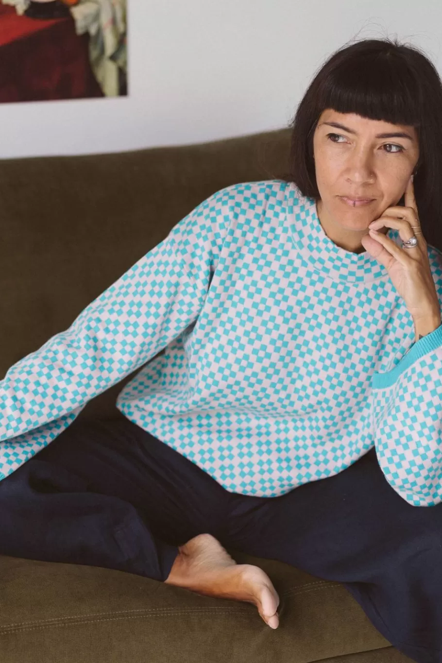 Sepia Rose And Peacock Blue Jacquard Checker Pattern