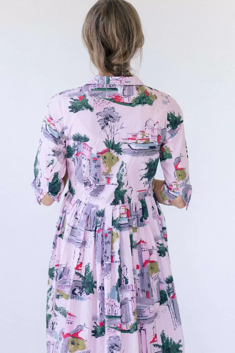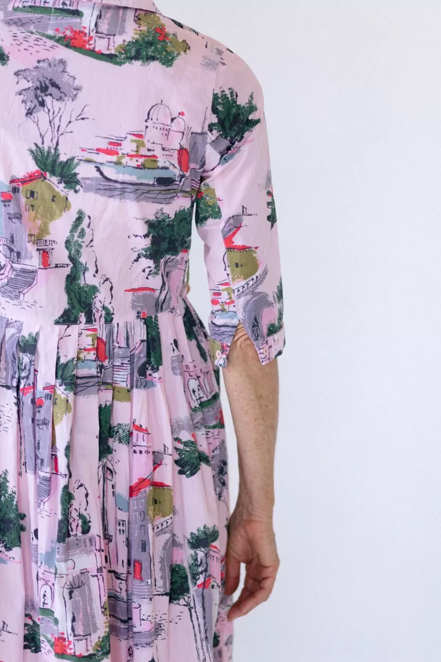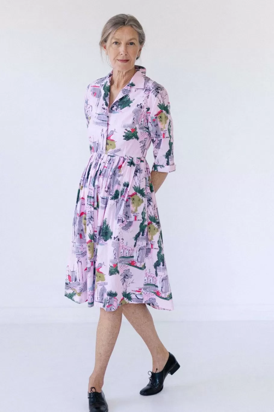Vintage Inspired Fit And Flare Dress With Shirt Style Bodice In Pink Sorrento Print.