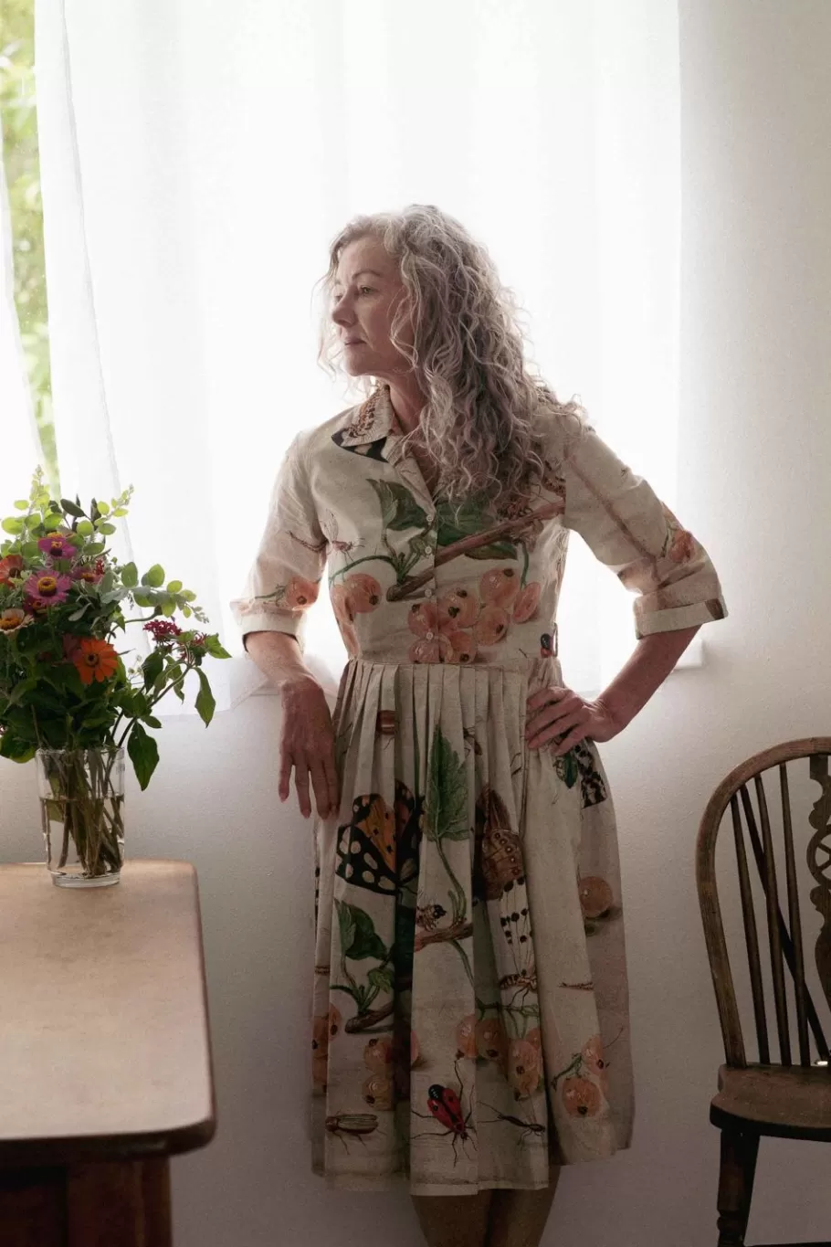 Pleated Skirt Finishes Just Below The Knee And Has Side Seam Pockets And 3/4 Length Cuffed Sleeves.