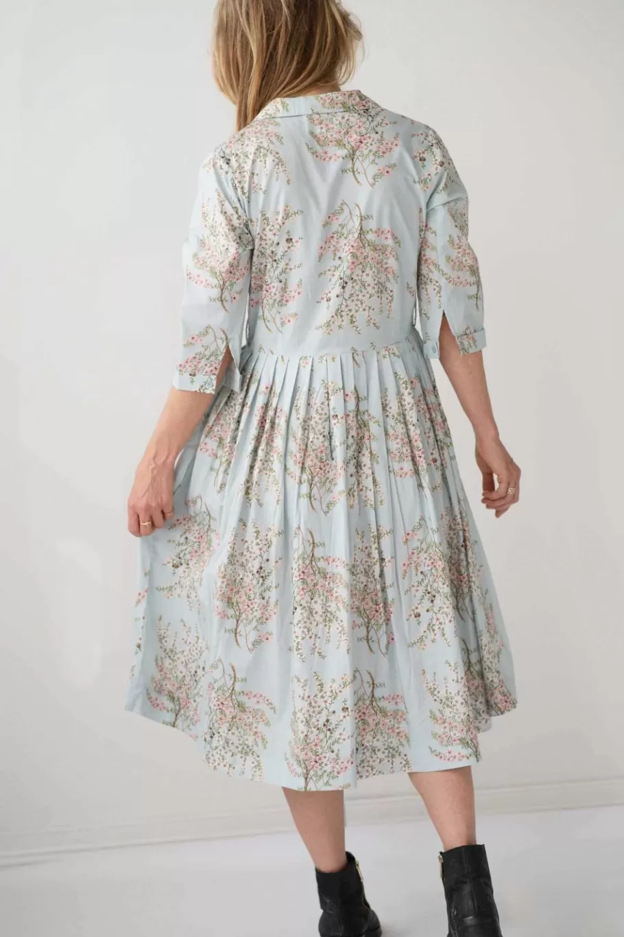 Our Gianna Dress Is Back In A Pretty Manuka Floral Print On A Pale Blue Background.