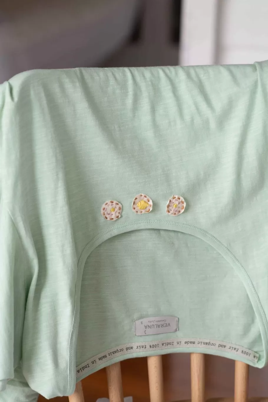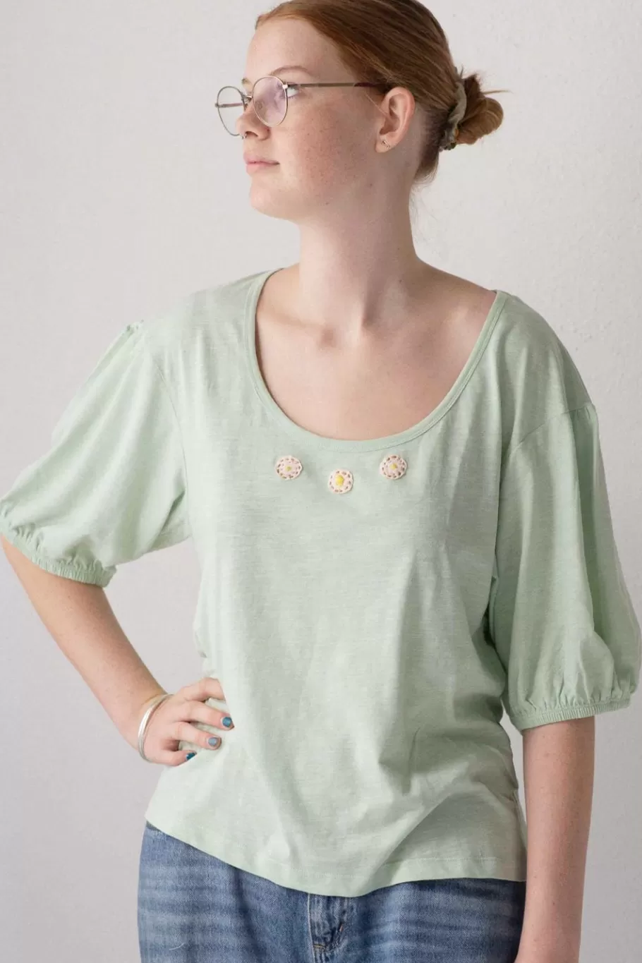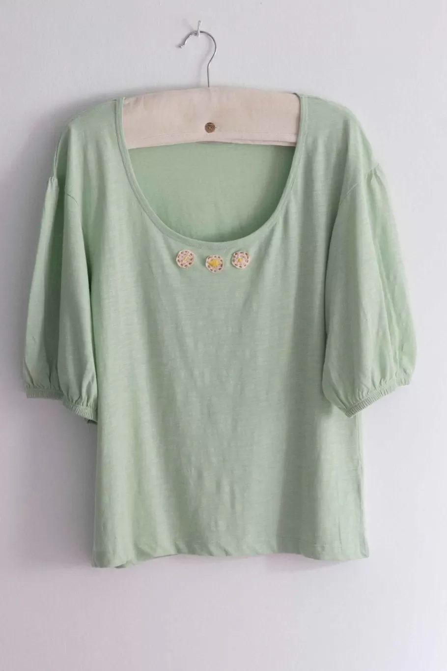 Scooped Neck Tee With Gathered Elbow Length Sleeves Featuring Small Hand Embroidered Dots At The Front Neckline