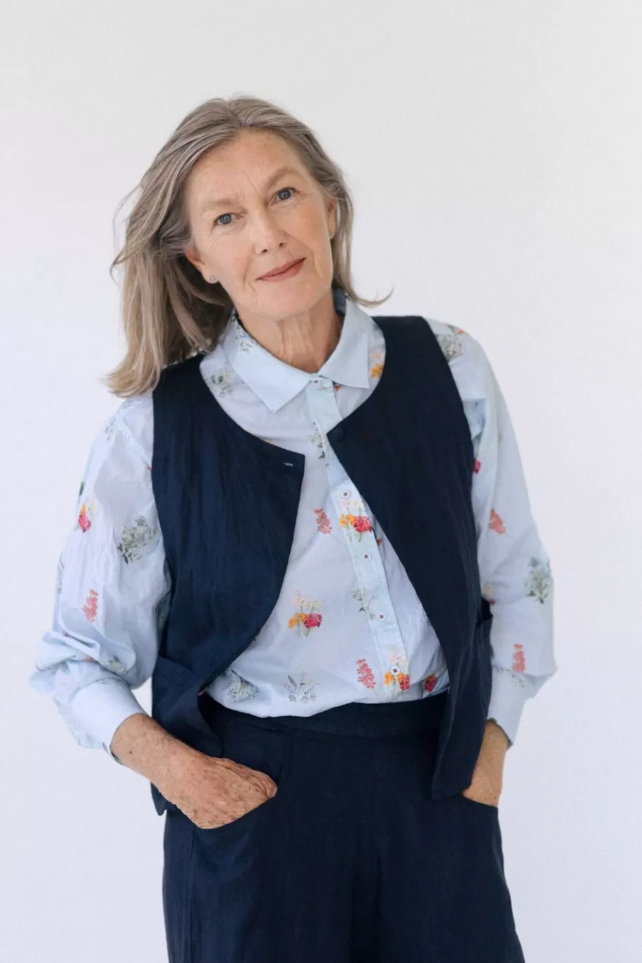 Liz Wears A Size S With Lauren Shirt In Wildflower And Ollie Pant In Dark Navy
