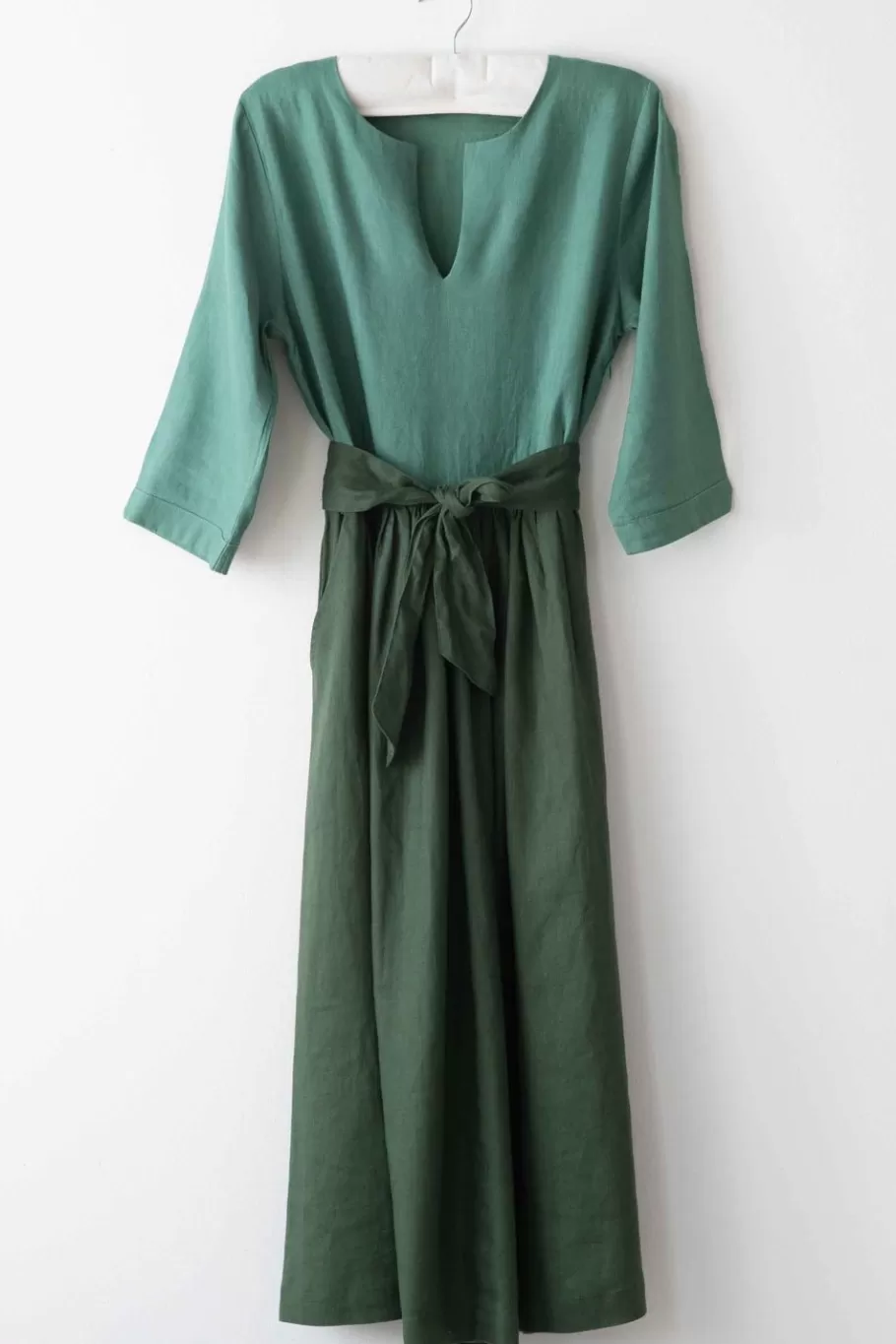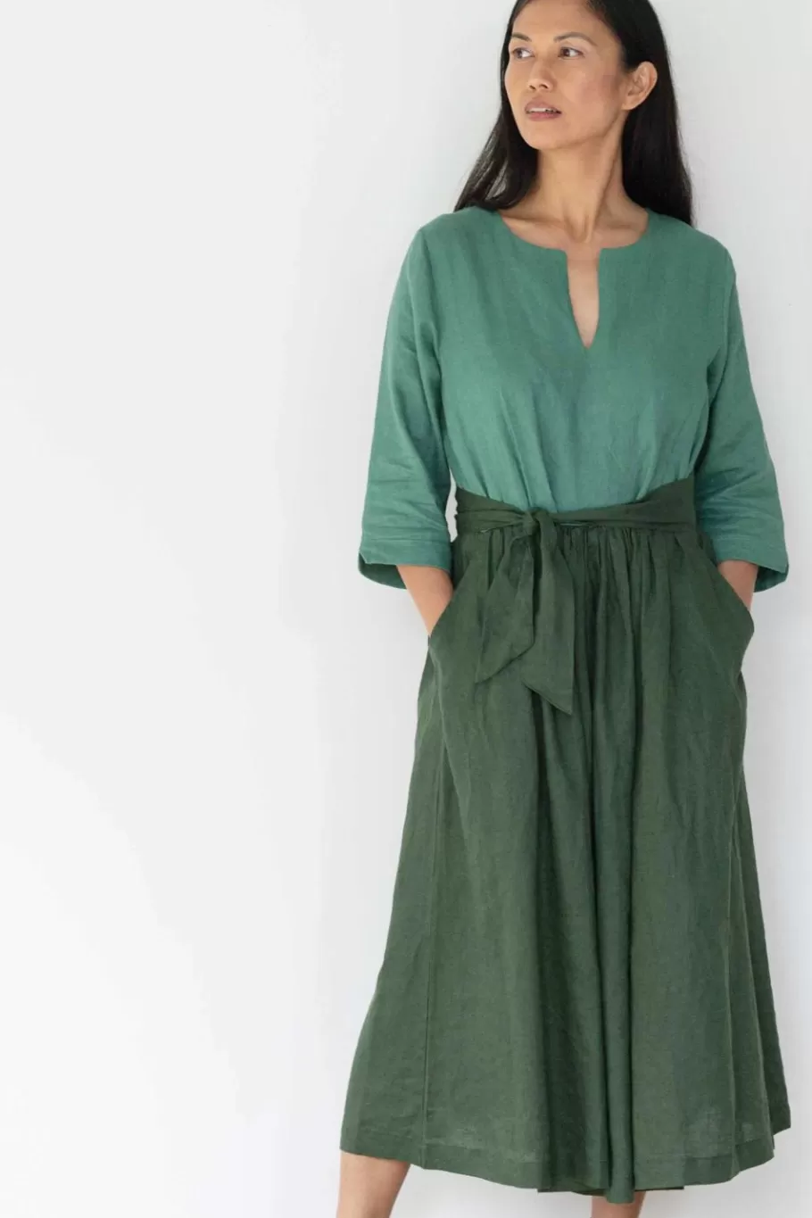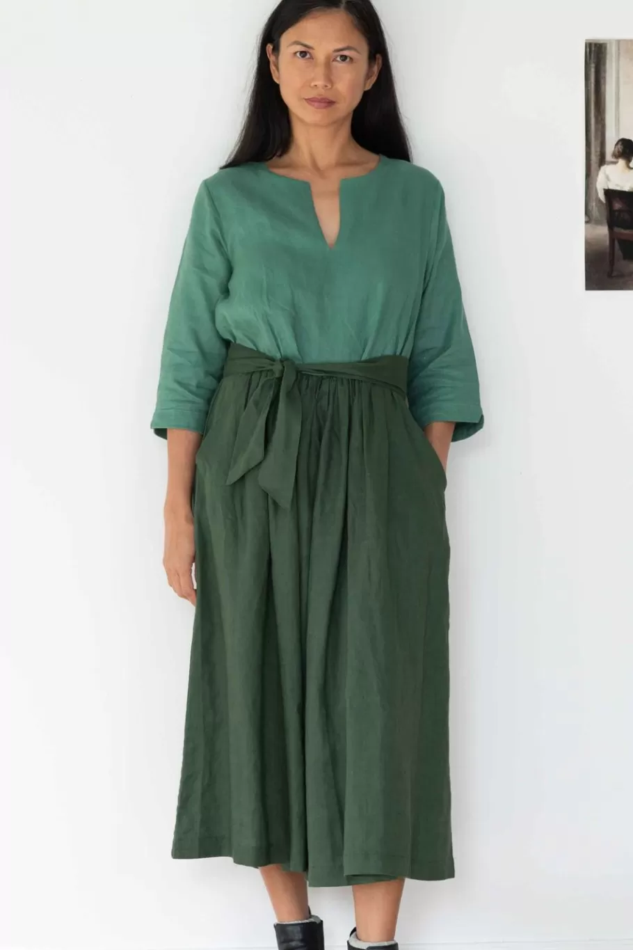 Michaela Is Our New Linen Dress With Bodice And Sleeves In Evergreen &Amp; Skirt And Belt In Forest.