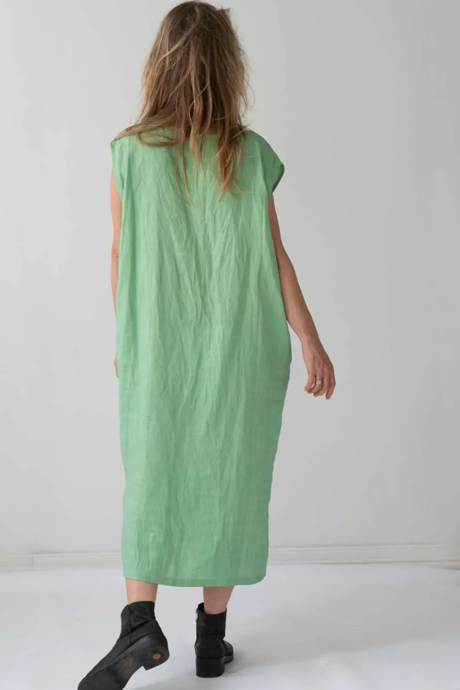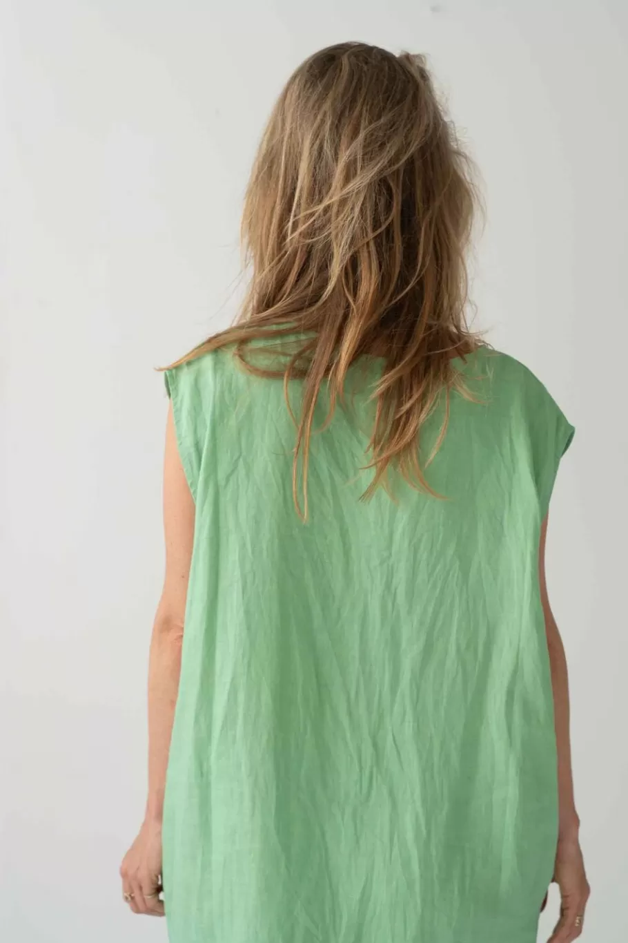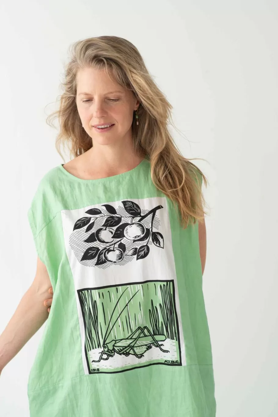 Polly Is A Dress Version Of Our Very Popular Peggy Top. This Time In A Fresh Mid Green Linen With A Panel Of A Digital Print On Organic Cotton In The Front.