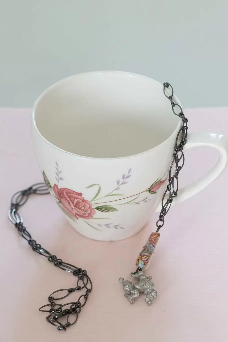 Necklace Featuring A Gunmetal Grey Chain Hung With 1950S Pewter Poodle Pendant And Beautiful Czech Glass Long Multicoloured Bead