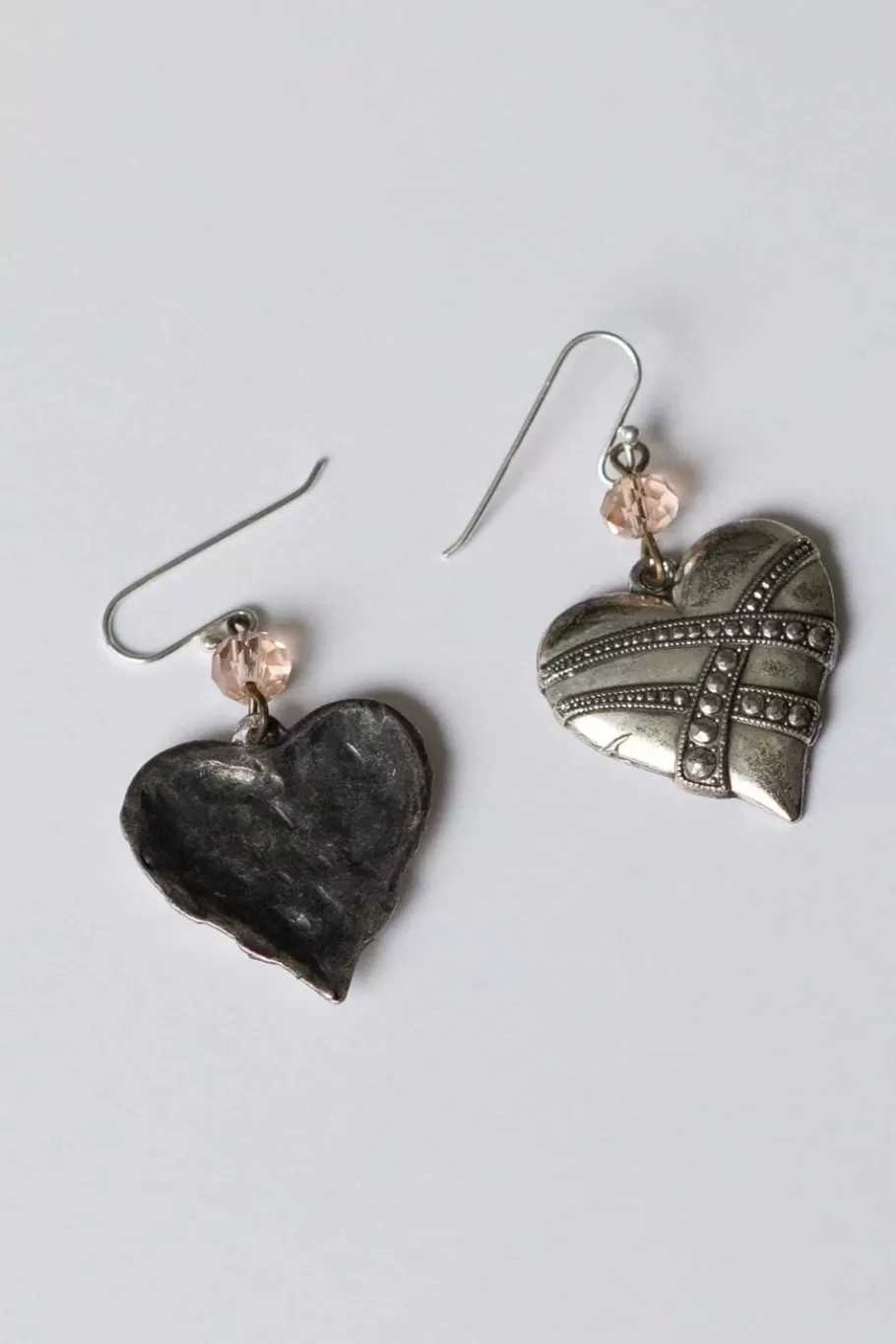 Vintage Cast Pewter Heart Charms From The 70’S Or 80’S Hung From 925 Sterling Silver Earring Hooks With Ball Ends And Small Pink Glass Faceted Bead.