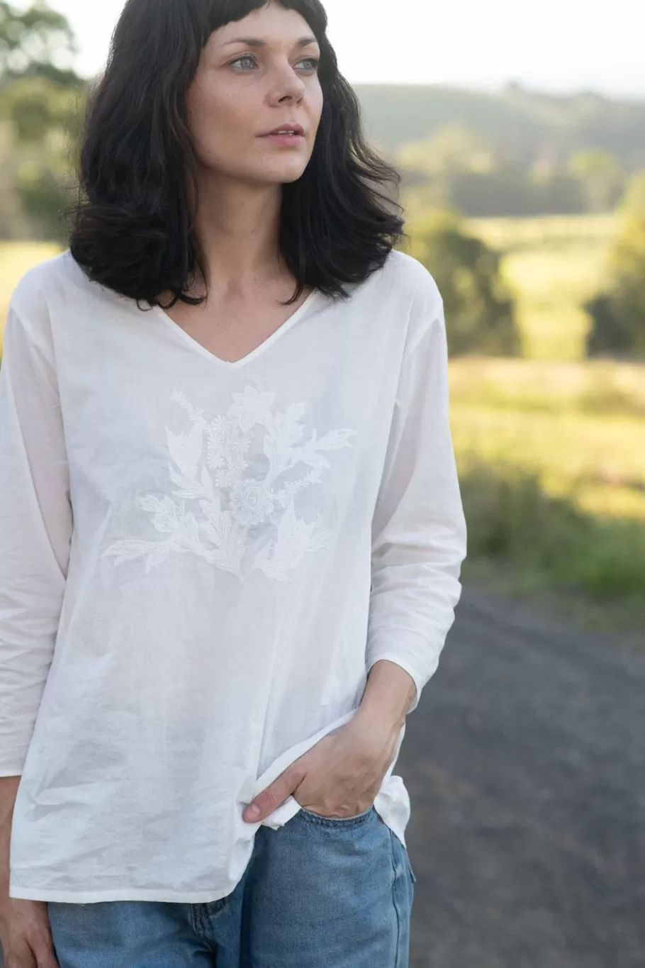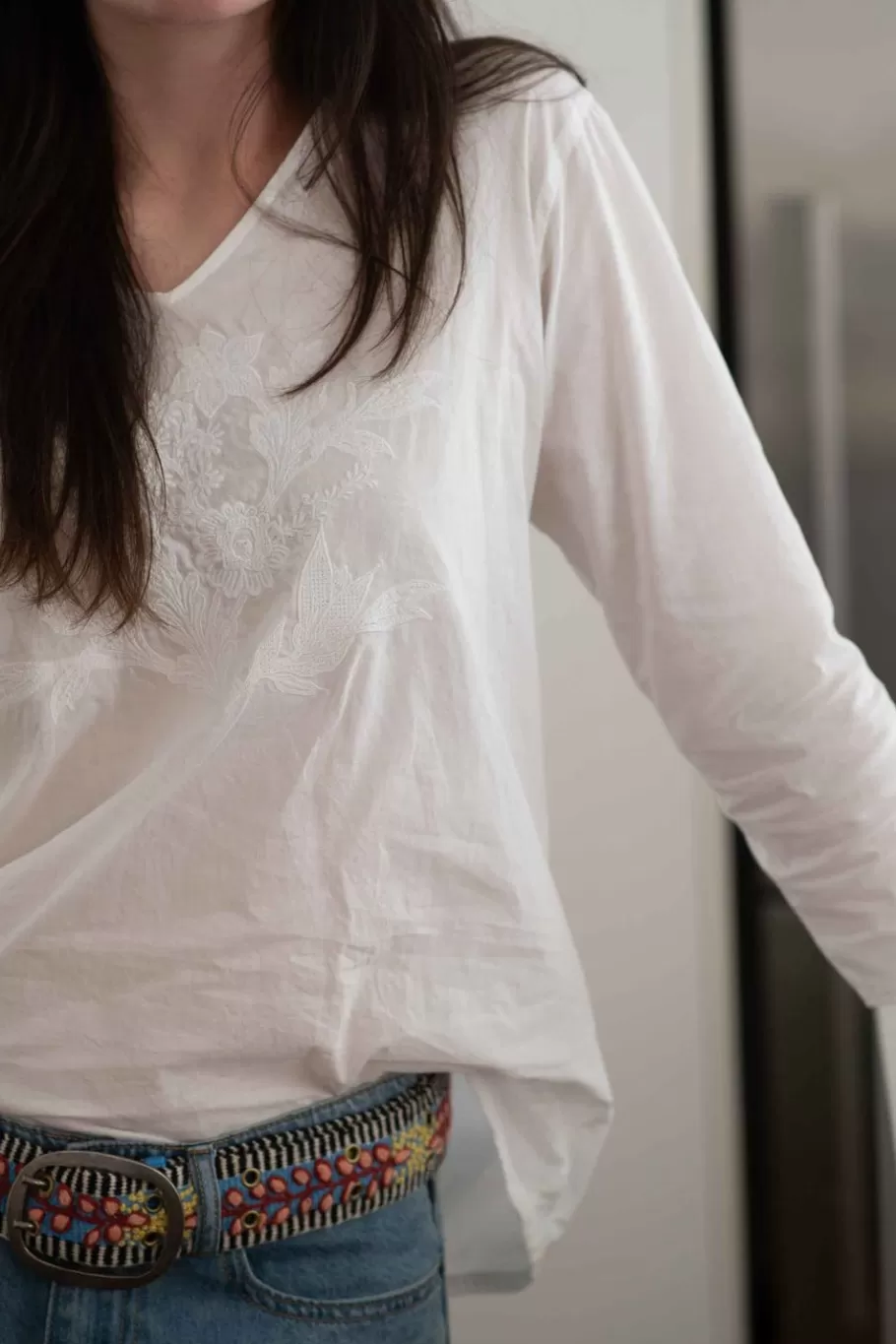 V-Neck Long Sleeved Cotton Voile Top With White Embroidery On Bodice Front.